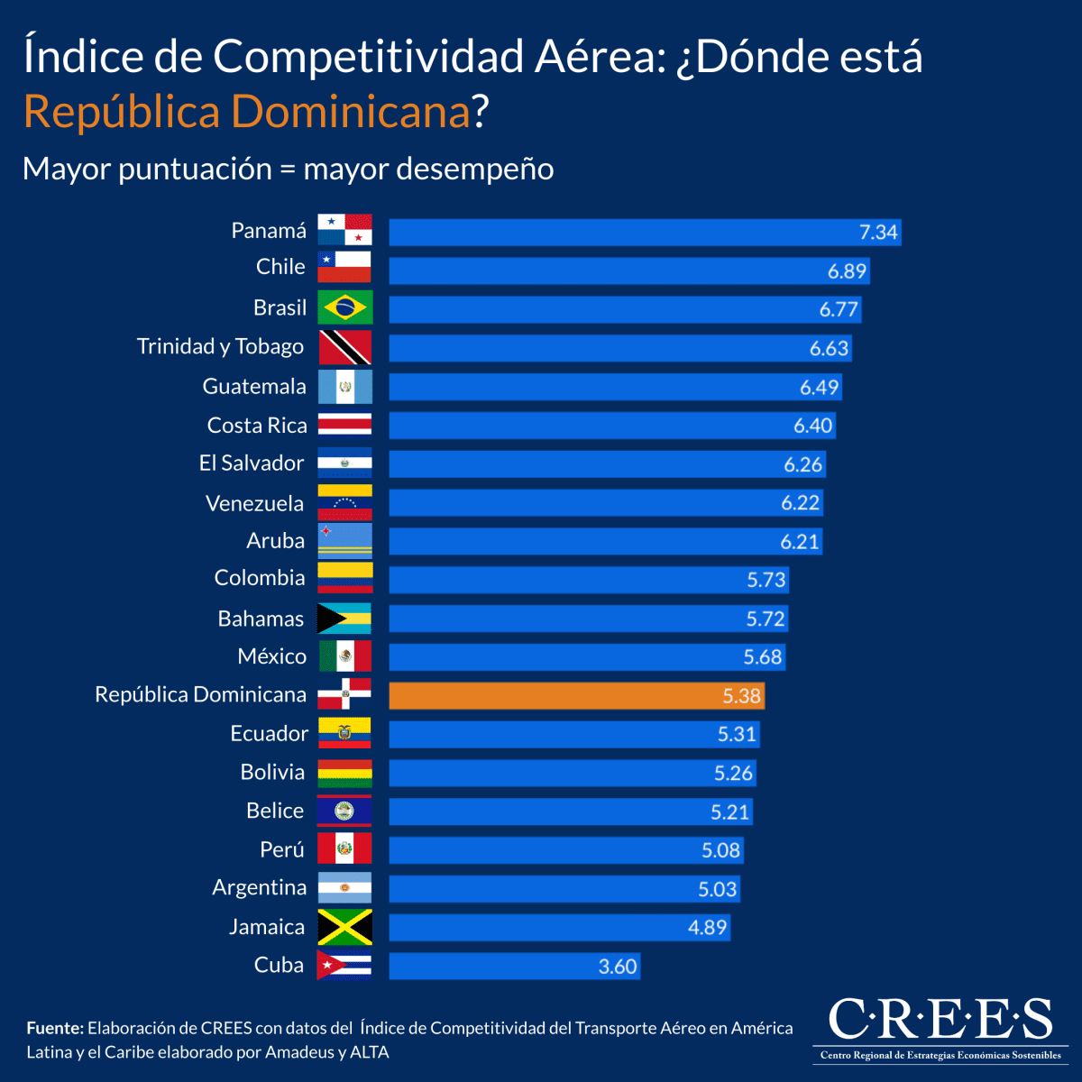 Con una puntuación de 5.38, República Dominicana ocupa la posición 13 de 20 en el Índice de Competitividad del Transporte Aéreo para América Latina y el Caribe, elaborado por Amadeus y la Asociación Latinoamericana y del Caribe de Transporte Aéreo (ALTA). Este índice evalúa el desempeño de los países en siete pilares principales, proporcionando un panorama integral de las fortalezas y desafíos en el sector aéreo de cada nación.