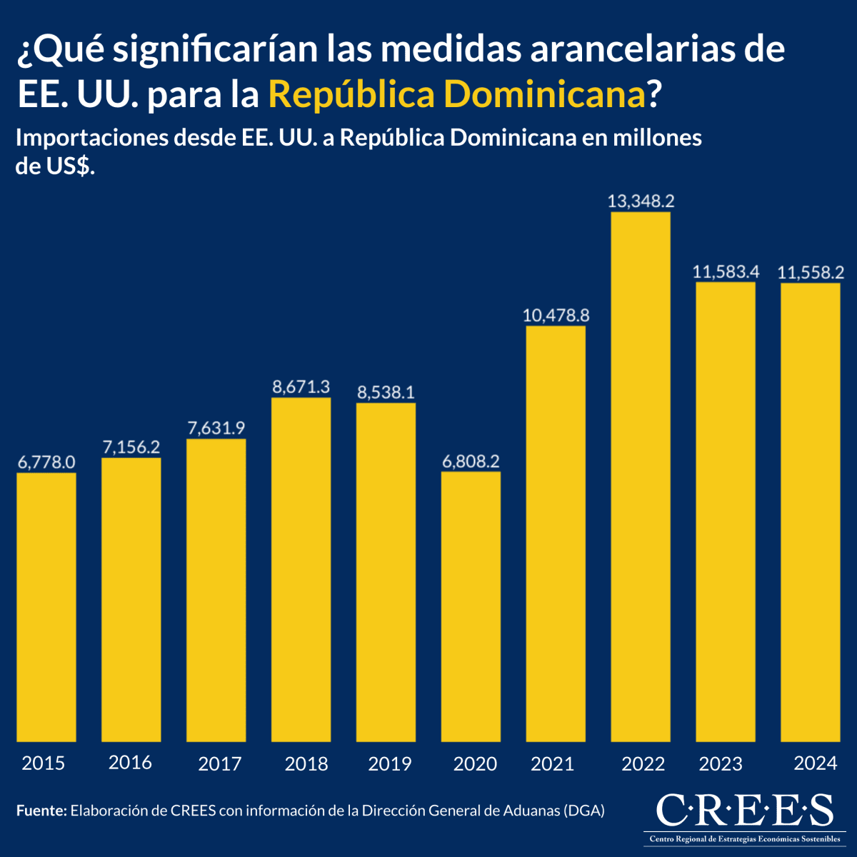 Para la economía dominicana, el impacto de estas medidas podría ser significativo debido a su alta dependencia de bienes importados desde Estados Unidos. En 2024, cita el CREES, las importaciones desde ese país alcanzaron los US$11,558.2 millones, consolidando a EE.UU. como el principal socio comercial de la República Dominicana. Según el CREES, Estados Unidos es el mayor proveedor de bienes esenciales en sectores clave como energía, manufactura y transporte.