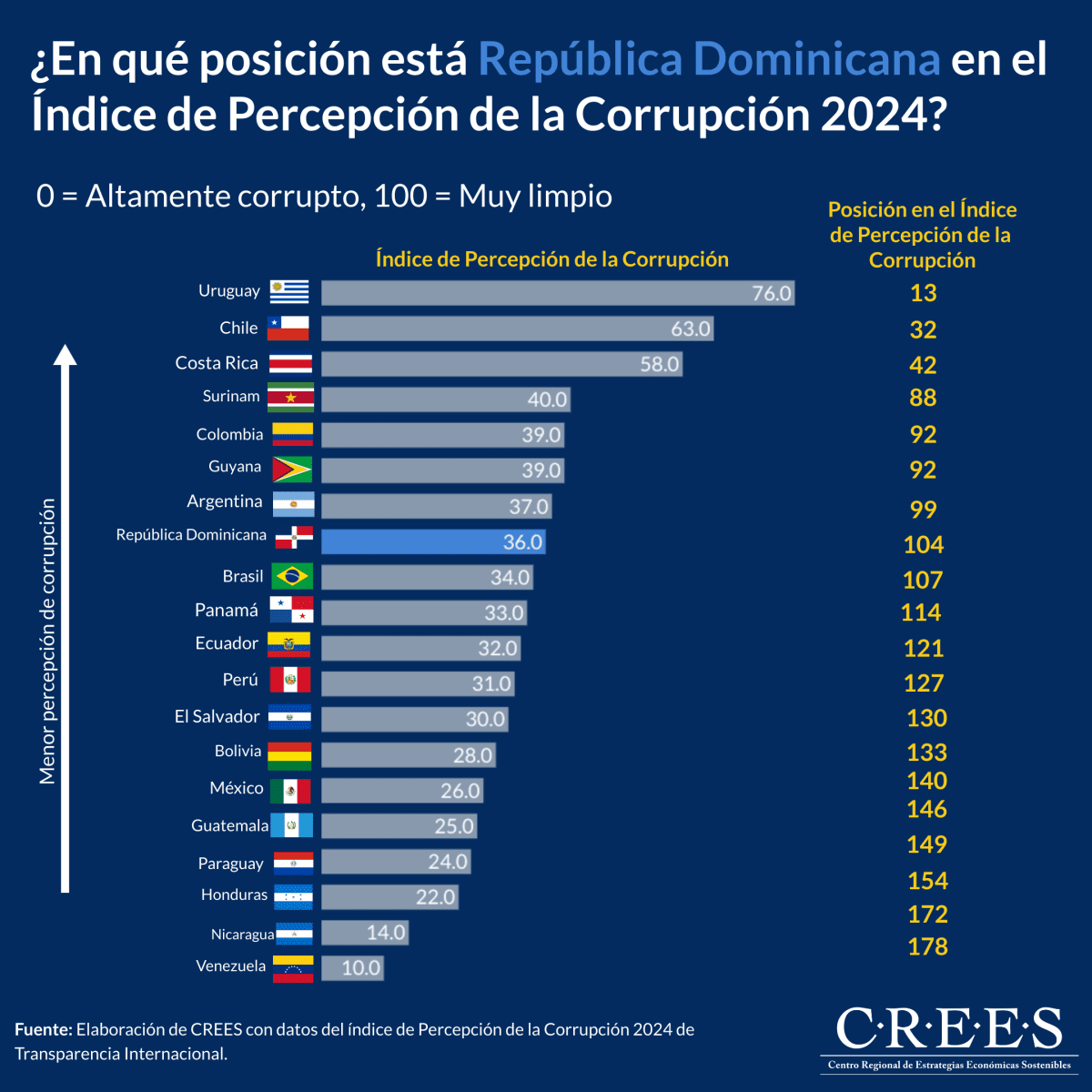 República Dominicana ocupa la posición 104 de 180 países en el Índice de Percepción de la Corrupción 2024 de Transparencia Internacional, con un puntaje de 36 sobre 100. Esto representa una leve mejora en comparación con el año anterior, cuando obtuvo 35 puntos y se ubicó en el puesto 108. En los últimos cuatro años, el país ha avanzado seis puntos, reflejando algunos avances en transparencia y control de la corrupción, aunque todavía se encuentra por debajo del promedio global y de varios países de la región.