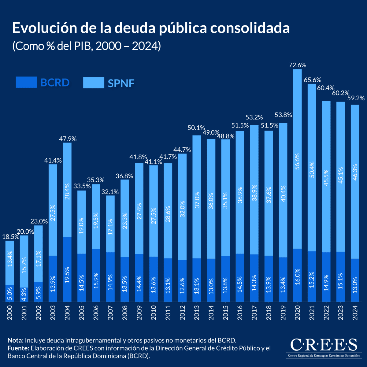 La deuda pública consolidada (incluyendo deuda intergubernamental) al cierre de 2024 ascendió a US$73,746.8 millones💵. Este monto está compuesto por la deuda del Sector Público No Financiero (SPNF), que fue de US$57,587.2 millones, y la deuda del Banco Central de la República Dominicana (BCRD), que representó US$16,159.6 millones💰. Para ponerlo en perspectiva, la deuda se ha multiplicado aproximadamente 16.6 veces desde el año 2000.