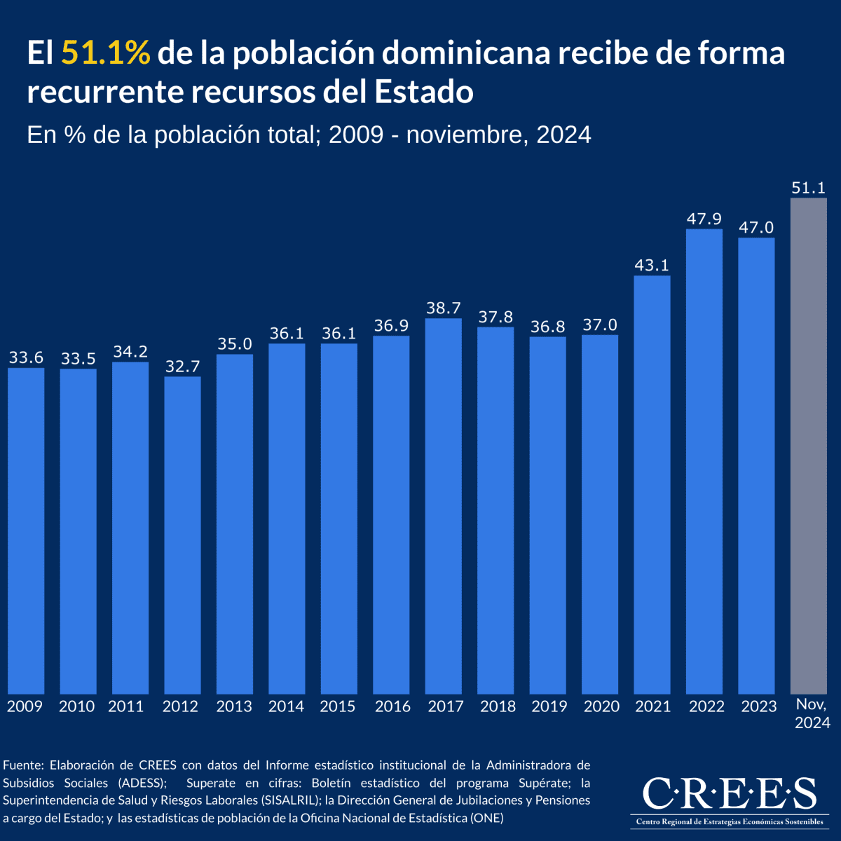 En los últimos años, la cantidad de personas que reciben ingresos recurrentes del Estado dominicano ha crecido de manera sostenida, alcanzando en noviembre de 2024 un total de 5.5 millones de personas, lo que representa el 51.1% de la población.