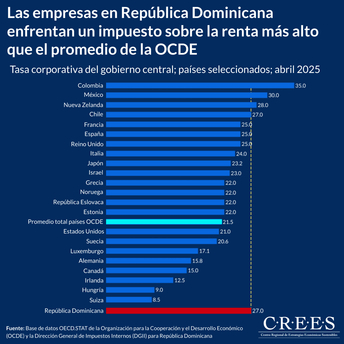 Las empresas dominicanas enfrentan una tasa de impuesto corporativo del 27%, considerablemente superior al promedio de los países de la OCDE (21.5%). Esta diferencia representa un desafío importante para la competitividad nacional, especialmente en un contexto global donde la carga tributaria influye significativamente en las decisiones de inversión.