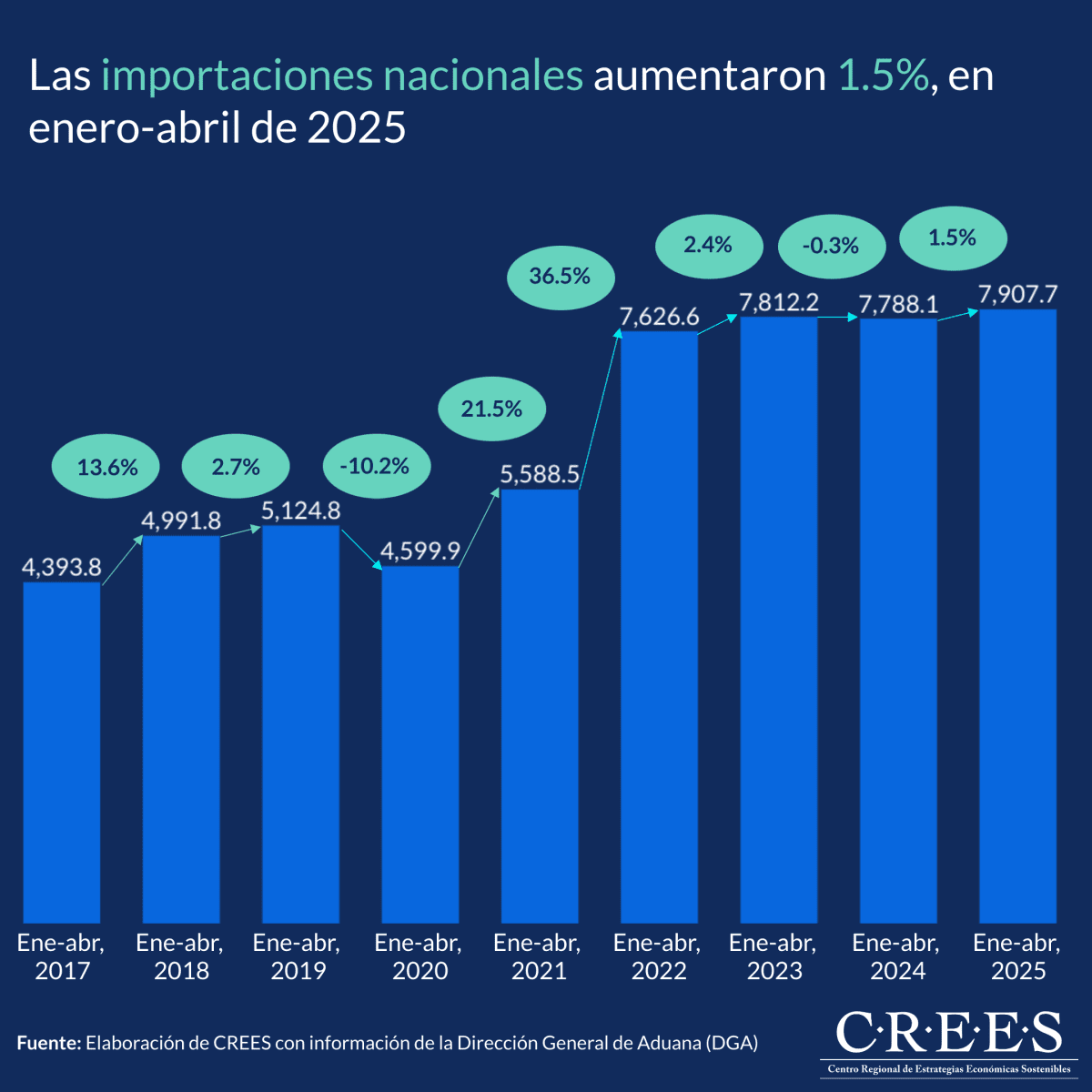 En el período enero-abril de 2025, las importaciones nacionales totalizaron US$7,907.7 millones, registrando un crecimiento del 1.5% respecto a los US$7,788.1 millones del mismo período de 2024.