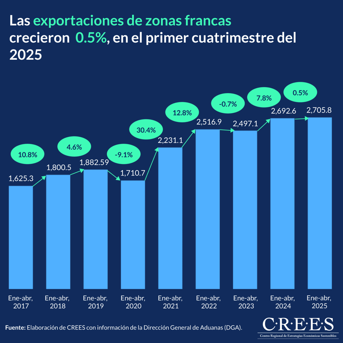 En el período enero-abril de 2025, las exportaciones del régimen de zonas francas alcanzaron un total de US$2,705.8 millones, lo que representa un crecimiento del 0.5% en comparación con los US$2,692.6 millones registrados en el mismo período de 2024.