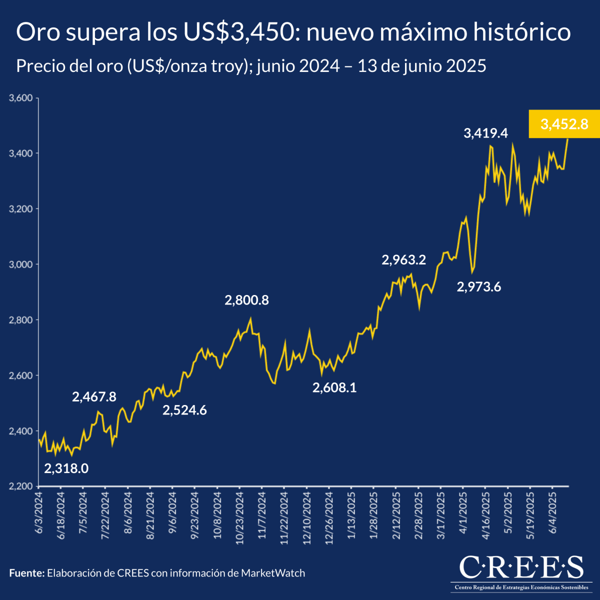 Entre junio de 2024 y el 13 de junio de 2025, el precio del oro aumentó más de US$1,100 por onza troy, alcanzando un récord de US$3,452.8. Este repunte ha sido impulsado por una combinación de factores monetarios, fiscales y geopolíticos que han fortalecido el atractivo del oro como activo refugio.