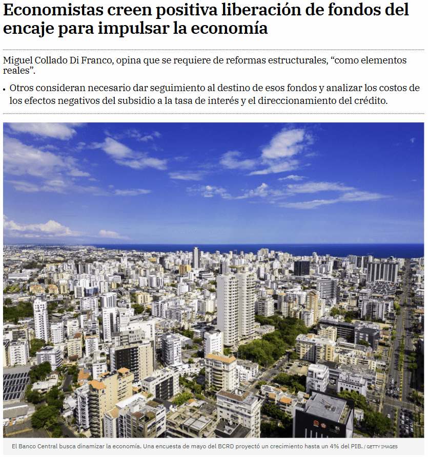 Economistas y empresarios valoran la liberación de los fondos del encaje legal liberados por el Banco Central para dinamizar la economía, y enfatizan en la necesidad de reformas estructurales y de verificar que vayan a sectores que generen empleos y crecimiento sostenible.