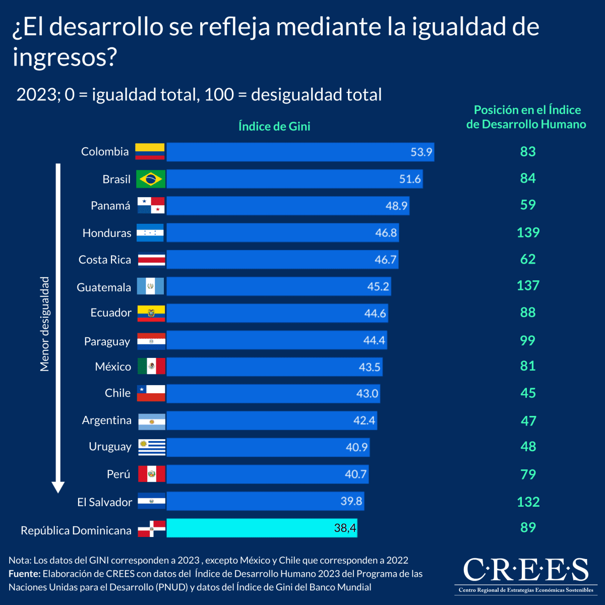Aunque la República Dominicana encabeza la región en igualdad de ingresos, entre los países con datos disponibles, ocupa el puesto 89 en el IDH global. Posicionándose por debajo de la mayoría de los países de la región, que muestran un mayor desarrollo humano a pesar de ser más desiguales. Asimismo, El Salvador, siendo el segundo menos desigual de América Latina, se sitúa en la posición 132 lo que refleja un nivel de desarrollo significativamente bajo.