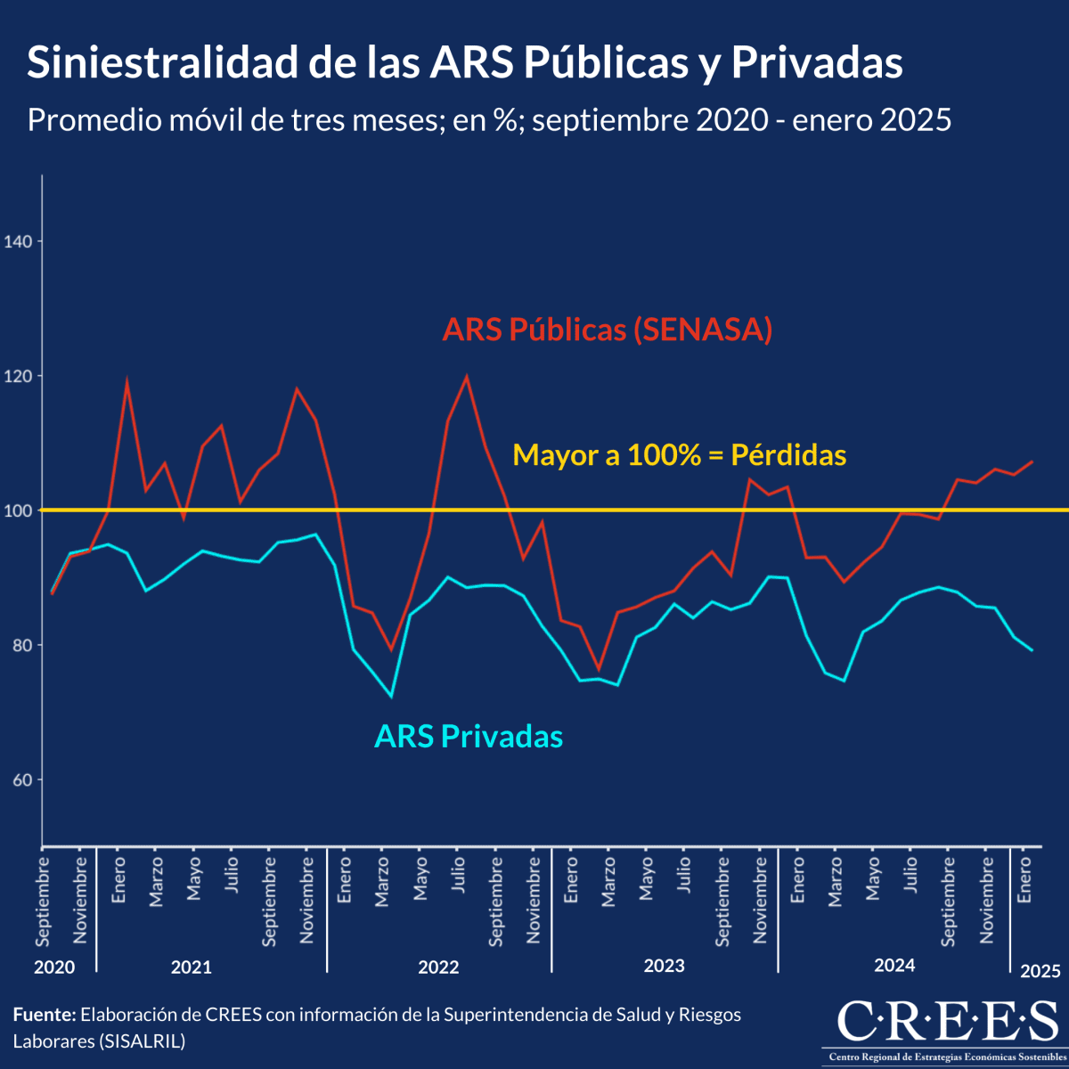 El informe presentado por el CREES incluye un gráfico que ilustra la siniestralidad de las aseguradoras de riesgos de salud (ARS), destacando que SENASA representa el 97 % de los casos cubiertos por las ARS públicas.