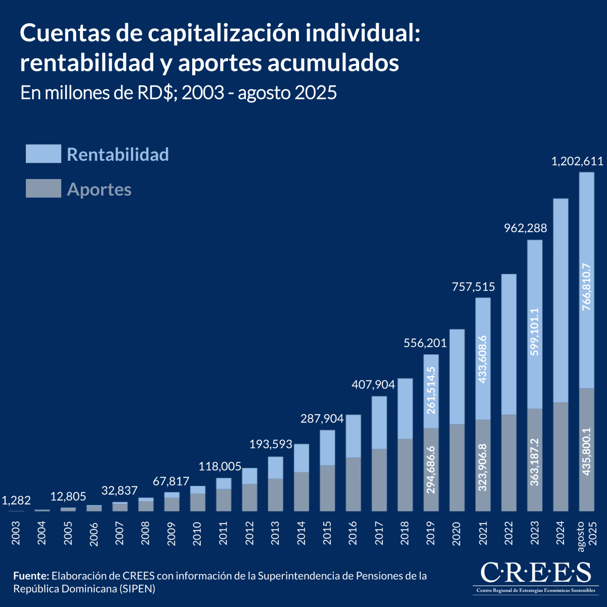 En agosto de 2025, las cuentas de capitalización individual acumularon RD$1.2 billones, cifra que refleja el notable crecimiento del sistema de pensiones desde su inicio en 2003. De ese total, RD$436,800 millones corresponden a los aportes directos de empleadores y trabajadores (36.2%), mientras que RD$766,811 millones —un 63.8%— provienen de la rentabilidad generada por las inversiones realizadas por las administradoras de fondos de pensiones (AFP).
