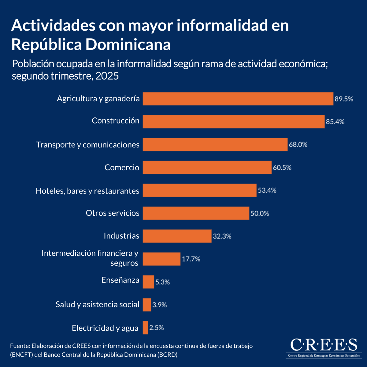 En contraste, las ramas con menores niveles fueron enseñanza (5.3%), salud y asistencia social (3.9%) y electricidad y agua con solo 2.5%, siendo la rama con menor informalidad.