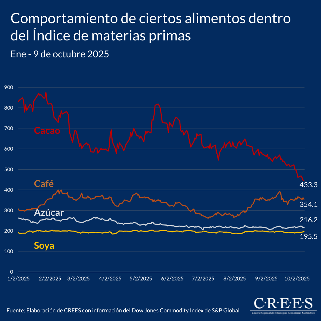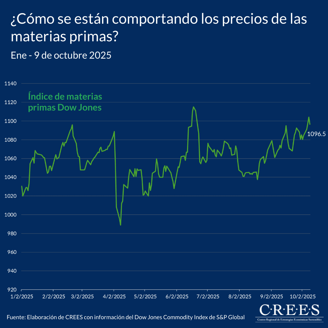 Entre enero y el 9 de octubre de 2025, el índice global de materias primas Dow Jones registra un aumento acumulado de 6.4%, reflejando un desempeño mixto entre los distintos grupos que lo componen.
