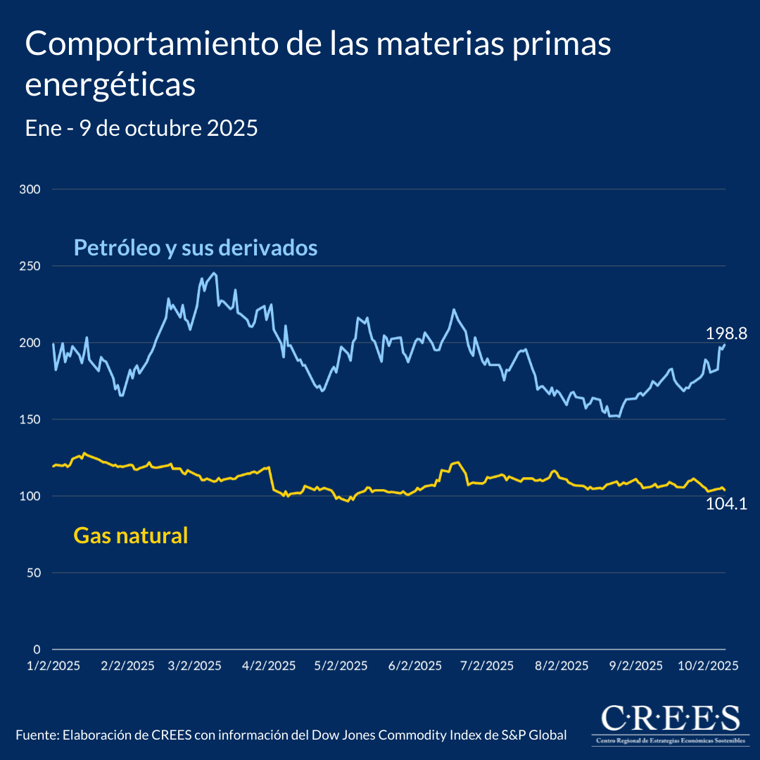 En el caso de la energía, los precios del petróleo y sus derivados han mostrado una tendencia descendente a lo largo del año (-12.9%), con caídas marcadas durante el segundo trimestre y cierta recuperación parcial desde agosto. El gas natural, en cambio, se mantiene prácticamente estable (-0.1%), reflejando una demanda más constante y una oferta relativamente equilibrada en los mercados internacionales.