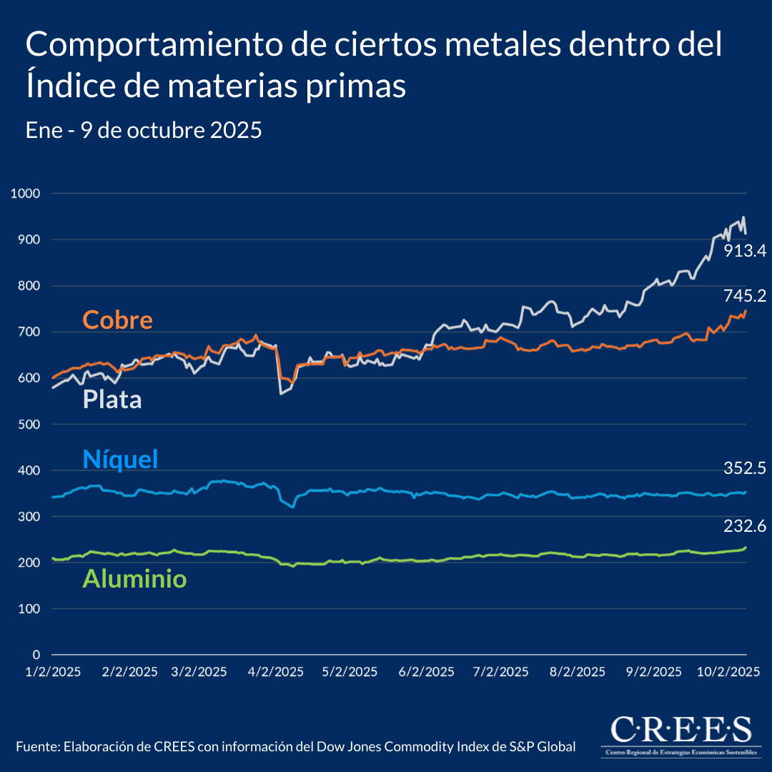 Por otro lado, entre los metales más importantes del índice después del oro, destacan aumentos significativos en la plata (+57.7 %) y el cobre (+24.2 %), junto con avances más moderados en el aluminio (+10.9 %) y el níquel (+3.1 %). En el caso de la plata, su desempeño combina factores monetarios y reales: la pérdida de poder adquisitivo de las monedas fiduciarias ha impulsado su atractivo como activo de resguardo, mientras la demanda industrial —particularmente en sectores como la electrónica y la energía solar— ha reforzado esa tendencia. En el caso del cobre y el aluminio, su comportamiento refleja el impacto de la transición energética y la mayor demanda de materiales conductores y ligeros en la industria global.