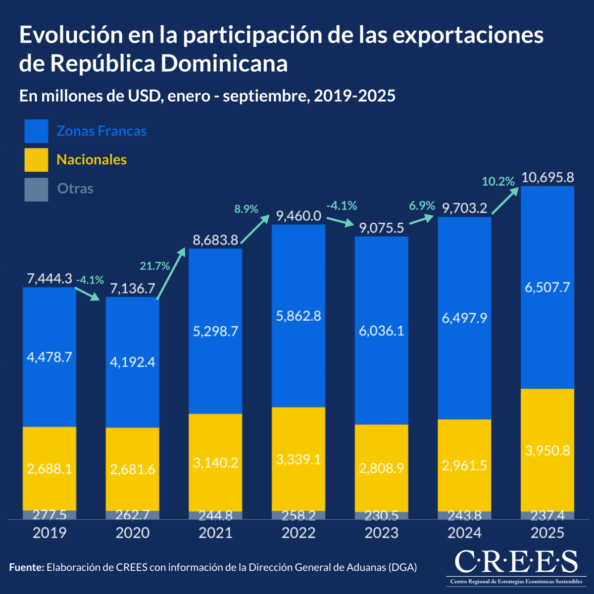 De acuerdo con datos de la Dirección General de Aduanas (DGA), en el período enero – septiembre de 2025, las exportaciones totales de la República Dominicana fueron de US$10,695.8 millones lo que representa un crecimiento de 10.2% respecto al mismo período de 2024.