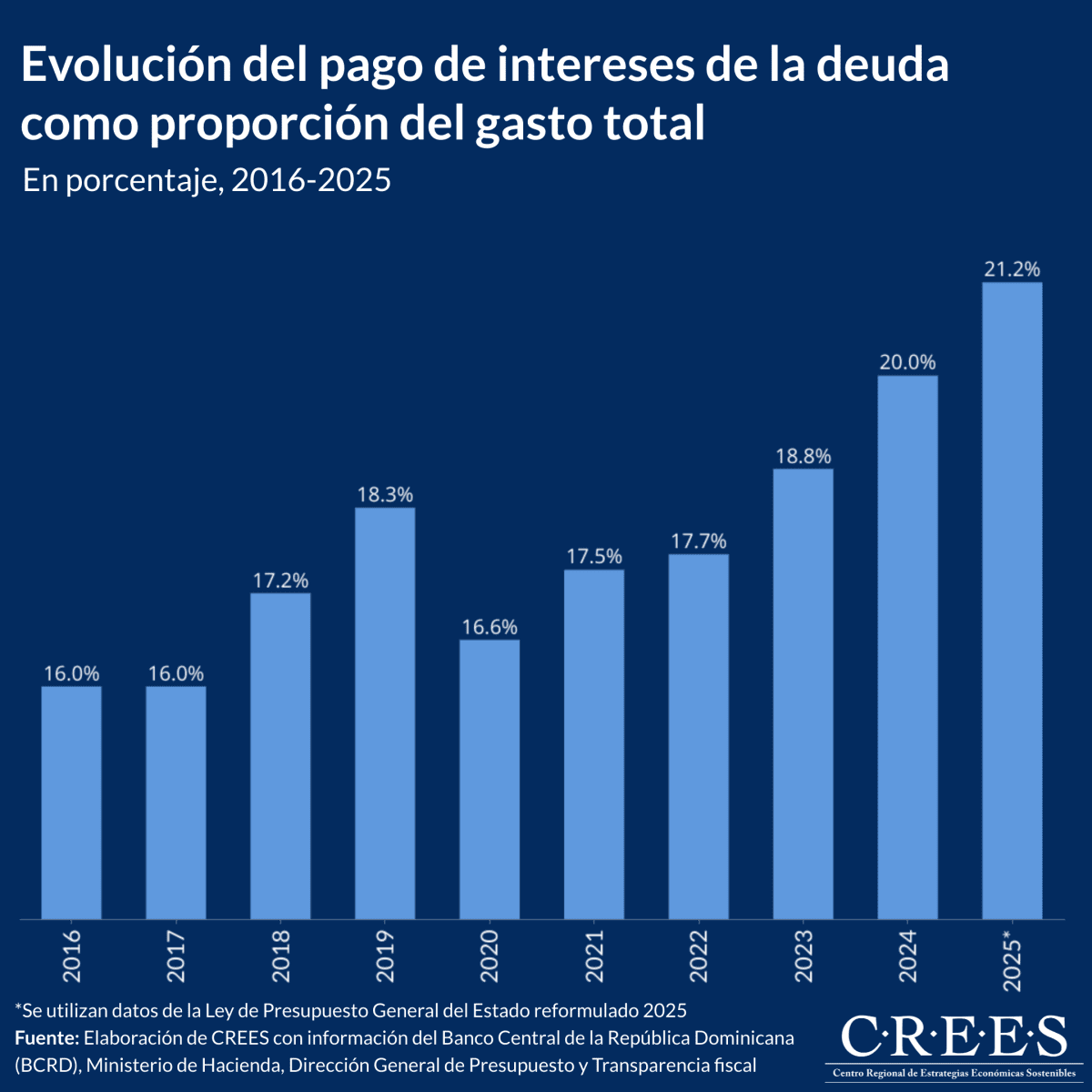 Como se ve en el gráfico, la proporción del gasto público que se destina a pagar intereses de la muestra una tendencia creciente en los últimos 10 años. En 2016, la República Dominicana destinaba 16% de su gasto total al pago de intereses de la deuda pública. Esta proporción ha seguido una tendencia creciente y, de acuerdo con el presupuesto de 2025, se destinarían RD$330,136.5 millones a este concepto, lo que representa un 21.2% del gasto público presupuestado.