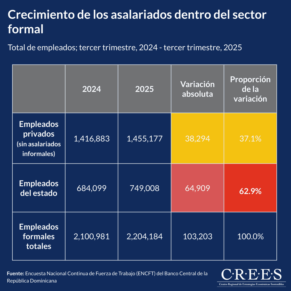 Según la Encuesta Nacional Continua de Fuerza de Trabajo (ENCFT) del Banco Central de la República Dominicana, entre el tercer trimestre de 2024 y el tercer trimestre de 2025 el número de empleados formales aumentó en 103,203 personas, equivalente a un incremento de un 4.9% interanual.