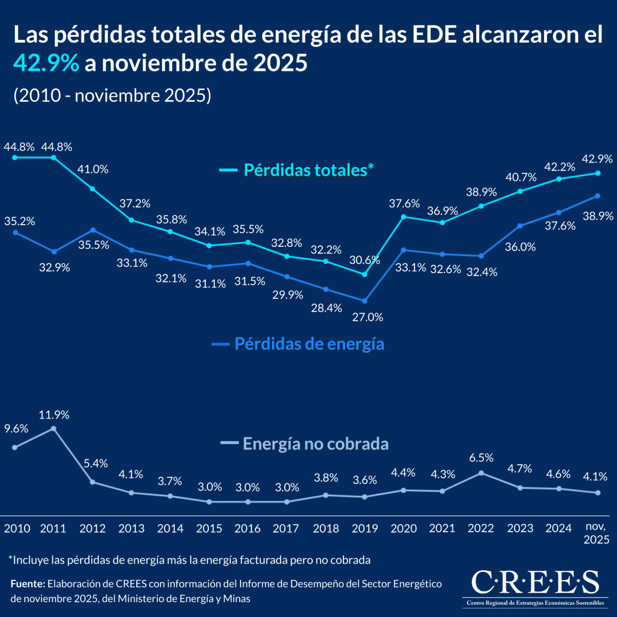 En términos absolutos, las EDE compraron 19,091.1 GWh durante enero-noviembre de 2025. De esa cantidad, 7,418.6 GWh no se facturaron, lo que representa pérdidas del 38.9% del total adquirido. A esta cifra se añade un 4.1% correspondiente a energía facturada pero no cobrada. La suma de ambas proporciones da como resultado el 42.9% de pérdidas totales registradas hasta noviembre de 2025.