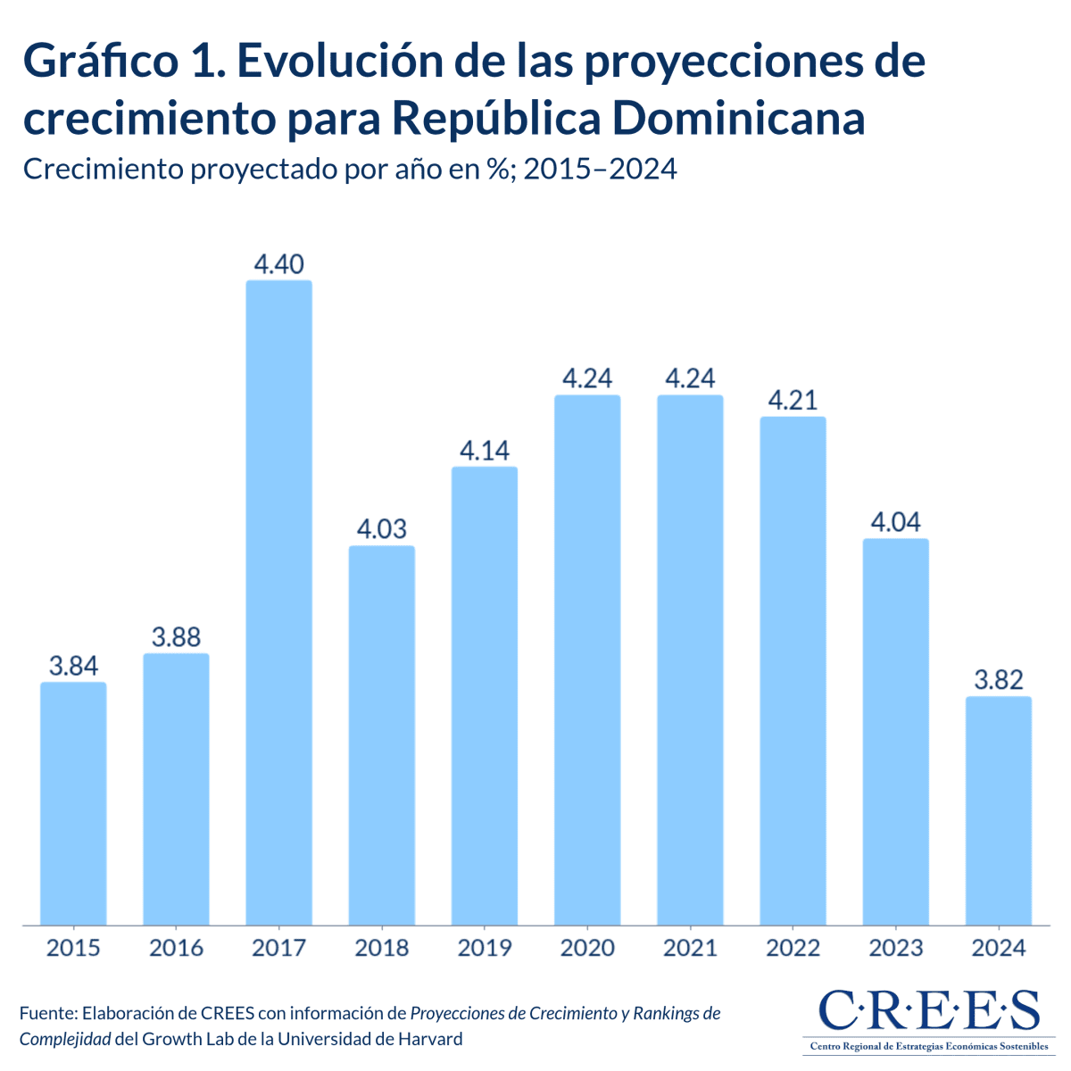 De acuerdo con las estimaciones del Harvard Growth Lab, el PIB real de República Dominicana podría crecer en torno a 3.82% anual en promedio hacia 2034.