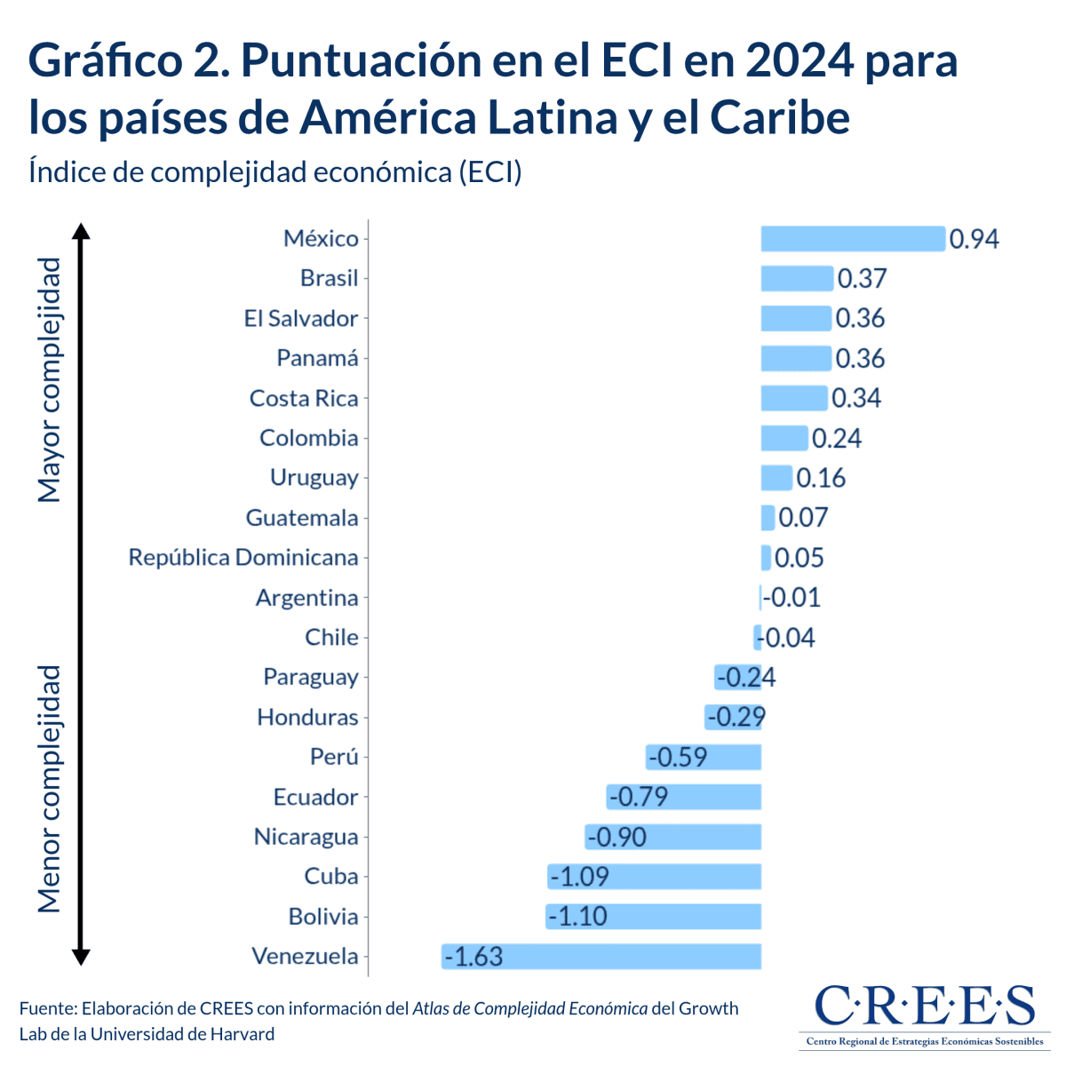 Países como Mexico o Brasil aparecen con valores altos de complejidad, es decir, exportan productos variados y sofisticados. En contraste, países como Venezuela dependen en gran medida de recursos naturales, es decir, tienen poca variedad en sus exportaciones y además están poco diversificados en su producción.