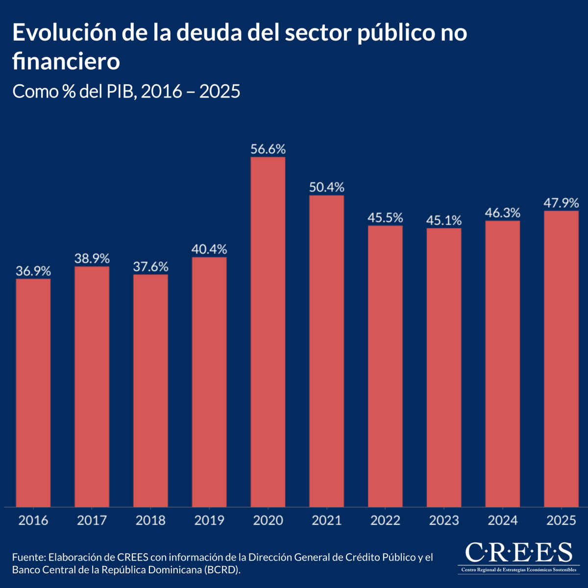 De acuerdo con la Dirección General de Crédito Público, al cierre de 2025, la deuda del Sector Público No Financiero (SPNF) fue de US$61,549.9 millones, es decir, 47.9% del PIB. Este nivel representa un incremento respecto a 2024, donde se situó en 46.3%, y continua la tendencia creciente que se puede ver durante todo el período.