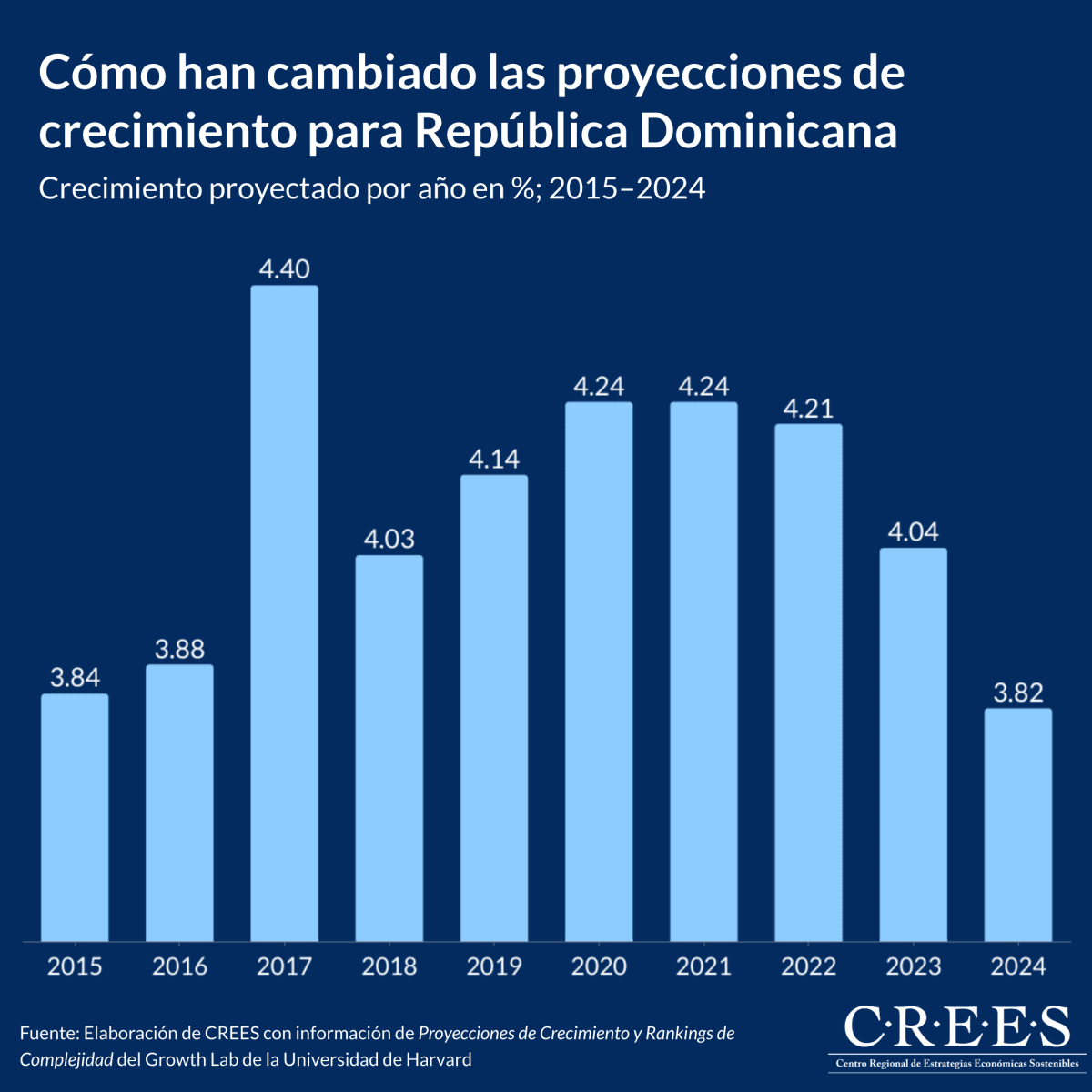 El Growth Lab de la Universidad de Harvard publicó sus más recientes proyecciones de crecimiento económico. Para República Dominicana, estas estimaciones indican que el Producto Interno Bruto (PIB) real podría expandirse en promedio en torno a 3.82% anual hacia 2034. Al mirar cómo han cambiado estas proyecciones a lo largo del tiempo, se nota que las estimaciones recientes son más bajas que las de años anteriores.