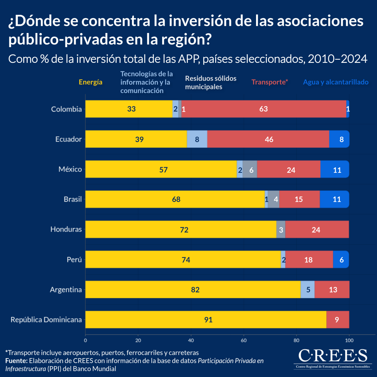 República Dominicana concentra el 91% de su inversión de APP en el sector energético —principalmente generación— la proporción más alta de los países seleccionados. Colombia, está más diversificado y destina el 63% al transporte. Chile, aunque no aparece en el gráfico por no estar cubierto en la base de datos del Banco Mundial utilizada, ofrece otro ejemplo ilustrativo, con un portafolio que abarca desde infraestructura vial hasta agua y alcantarillado. Esa diversidad refleja décadas de construcción institucional y un marco que atrae capital privado a múltiples sectores.