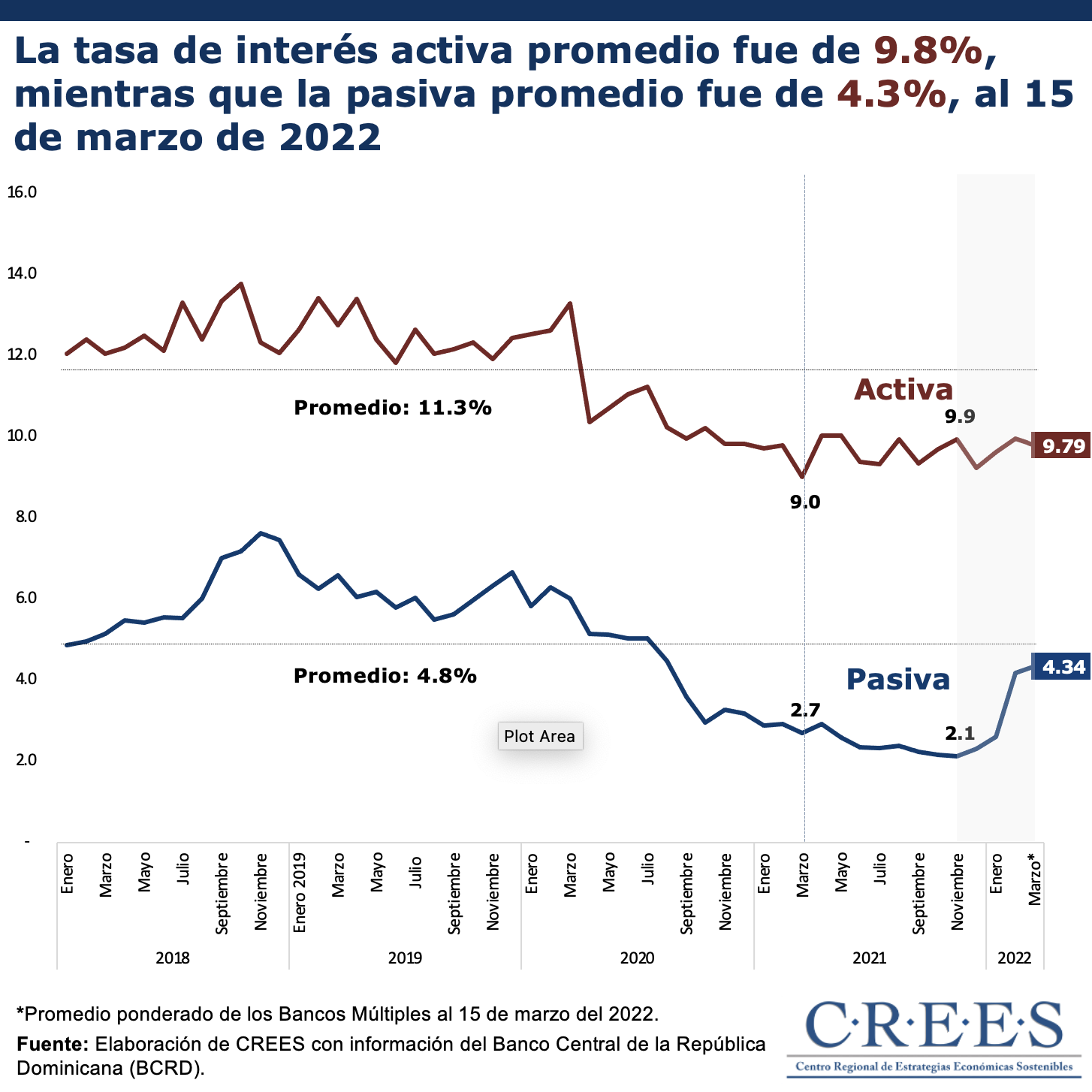 Al 15 de marzo de 2022, la tasa de interés activa promedio ponderada de los Bancos Múltiples fue de 9.8%, mientras que la tasa de interés pasiva promedio ponderada...